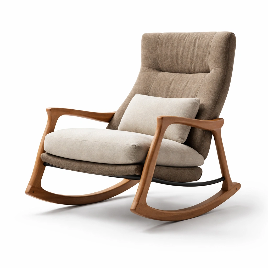 Der Schaukelstuhl hat einen Rahmen aus massivem Holz und Sitz- sowie Rückenkissen mit einem hochwertigen Polyesterbezug.