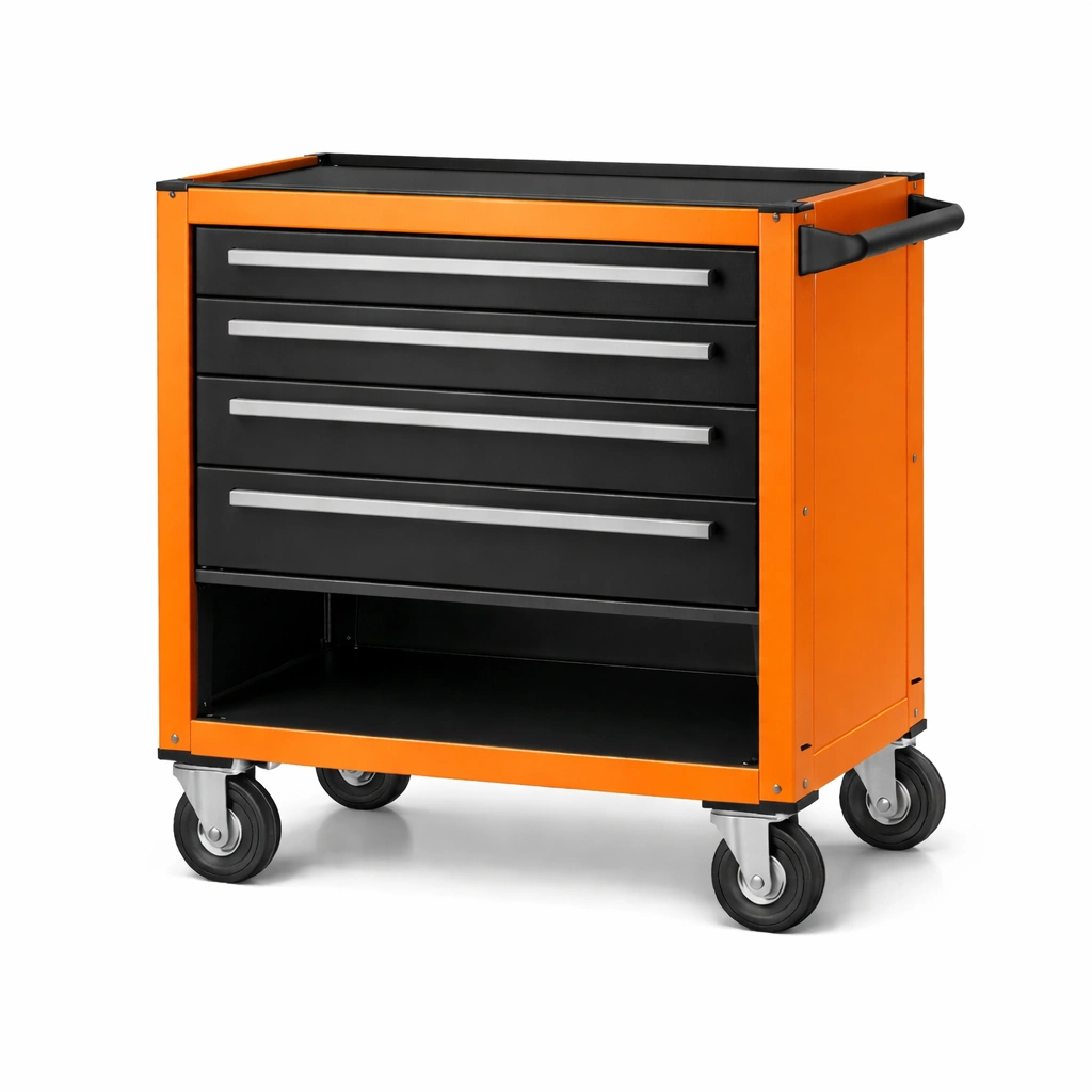 Werkstattwagen metall schwarz orange mit vier schubladen und schwenkrollen
